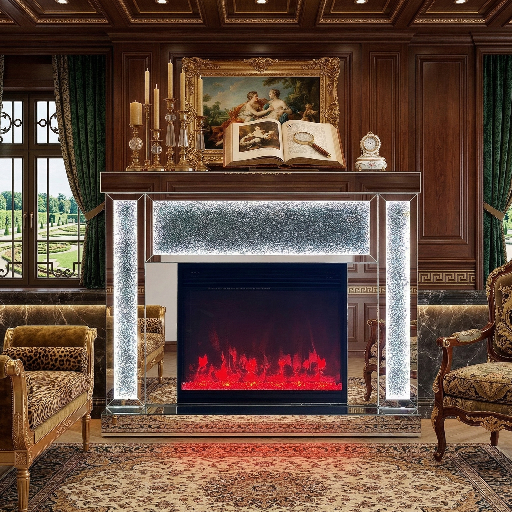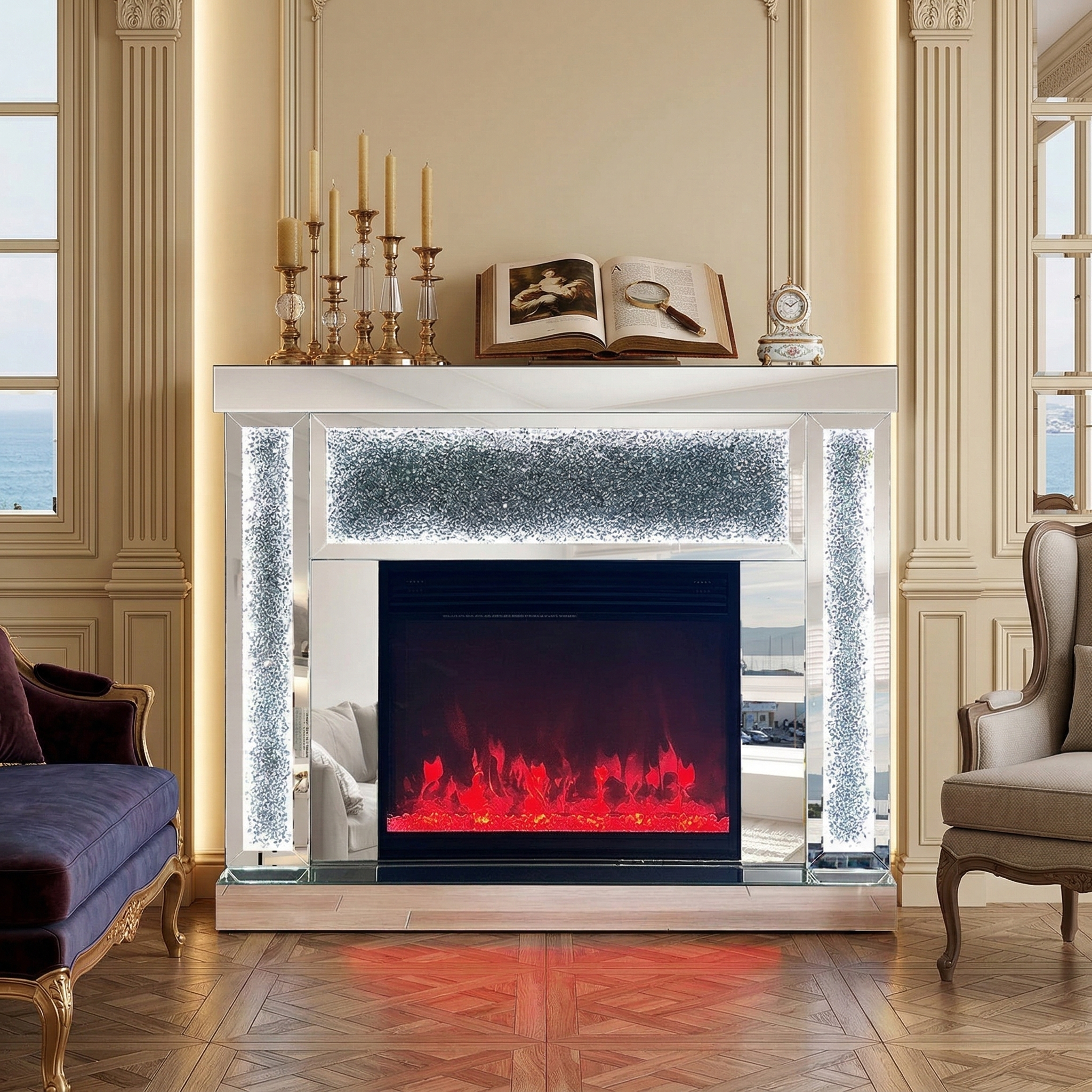 This mirrored fireplace TV stand is made of durable MDF combined with high-quality mirrored glass panels. The decorative crushed crystal inlay adds a bright and luxurious visual effect, while the mirrored frame enhances light reflection and modern interior appeal.
