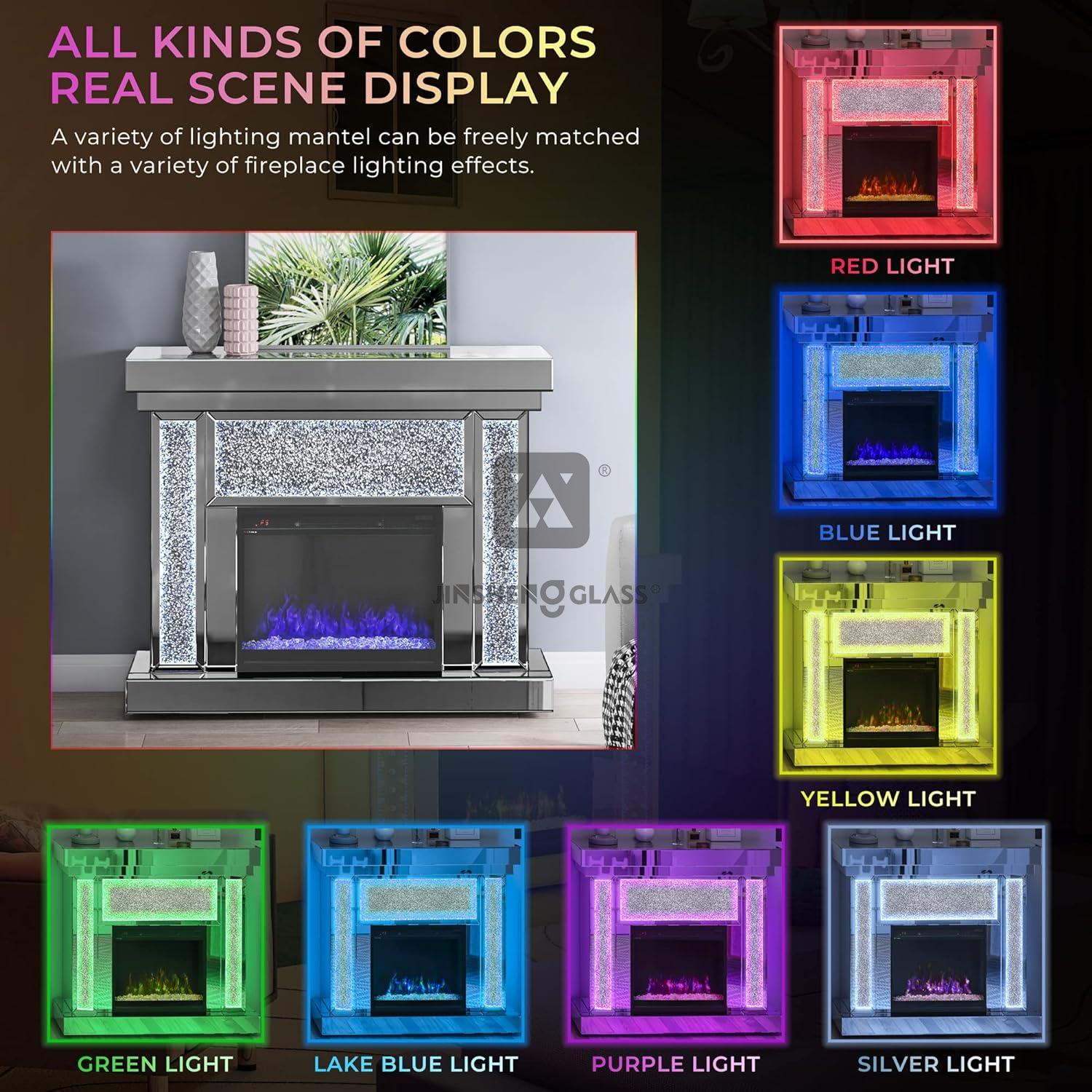 The JS-FP10 Mirrored Electric Fireplace is a versatile decorative heating solution featuring a high-quality silver mirror finish. This freestanding unit is designed to fit elegantly into corners or against main walls, providing a stunning 3D flame effect that can be customized with 10 different RGB color modes.