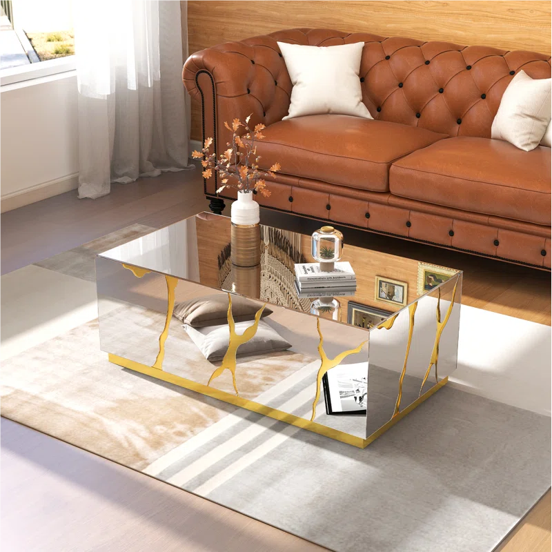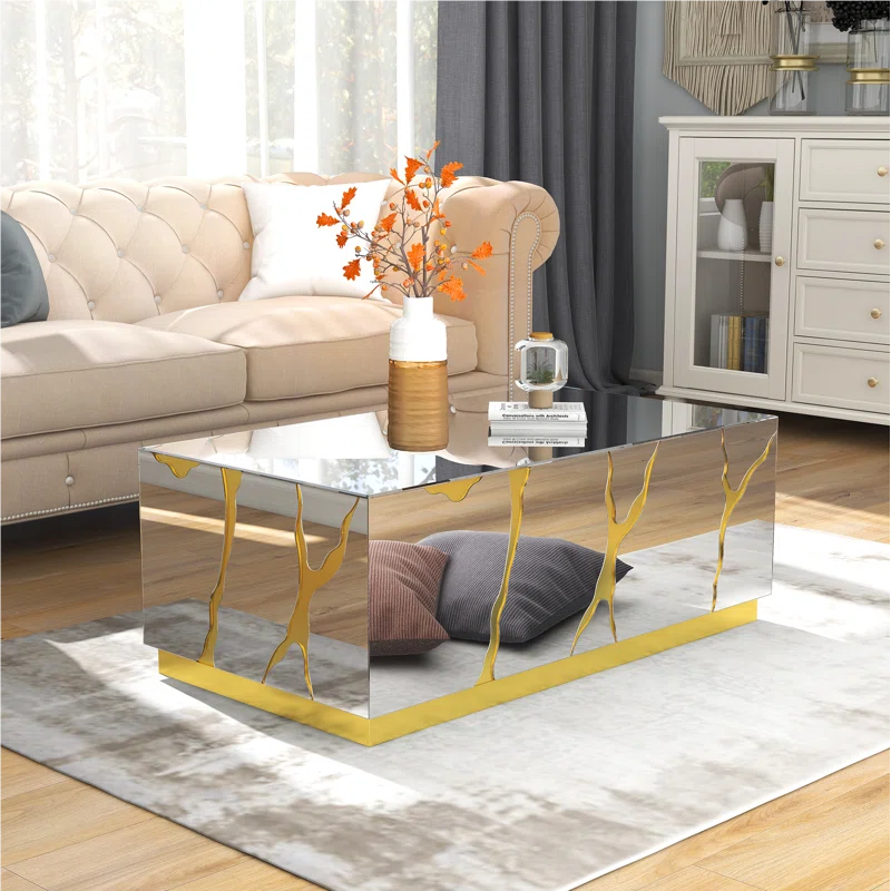 • Description: Mirrored Block Glass Rectangle Coffee Table With Unique Crackle Design
