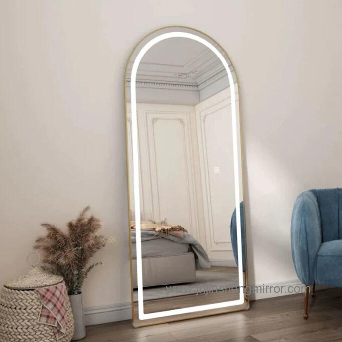 The JS-156 Arch LED Full Length Mirror features a sophisticated arched silhouette encased in a high-quality gold aluminum frame. The integrated LED lighting provides soft, ambient illumination, perfect for detailed dressing and vanity use.