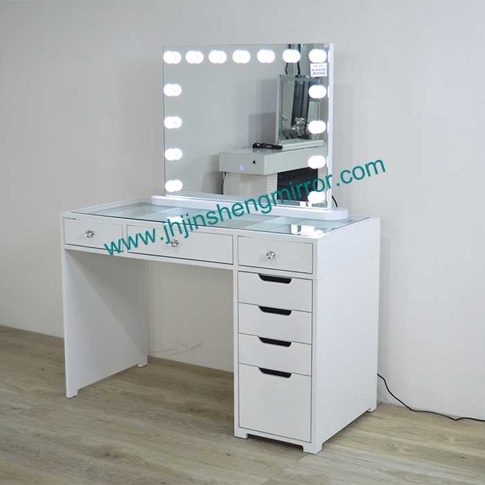 The accompanying white dressing table is constructed with high-quality MDF and features seven integrated drawers, offering ample storage for cosmetics and beauty tools. This set is perfect for residential bedrooms and professional makeup studios. Jinsheng Glass provides wholesale manufacturing with reliable export packaging for global furniture distributors.