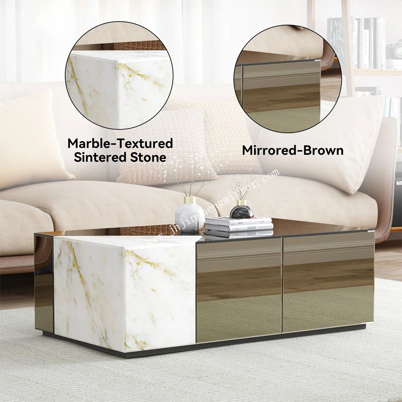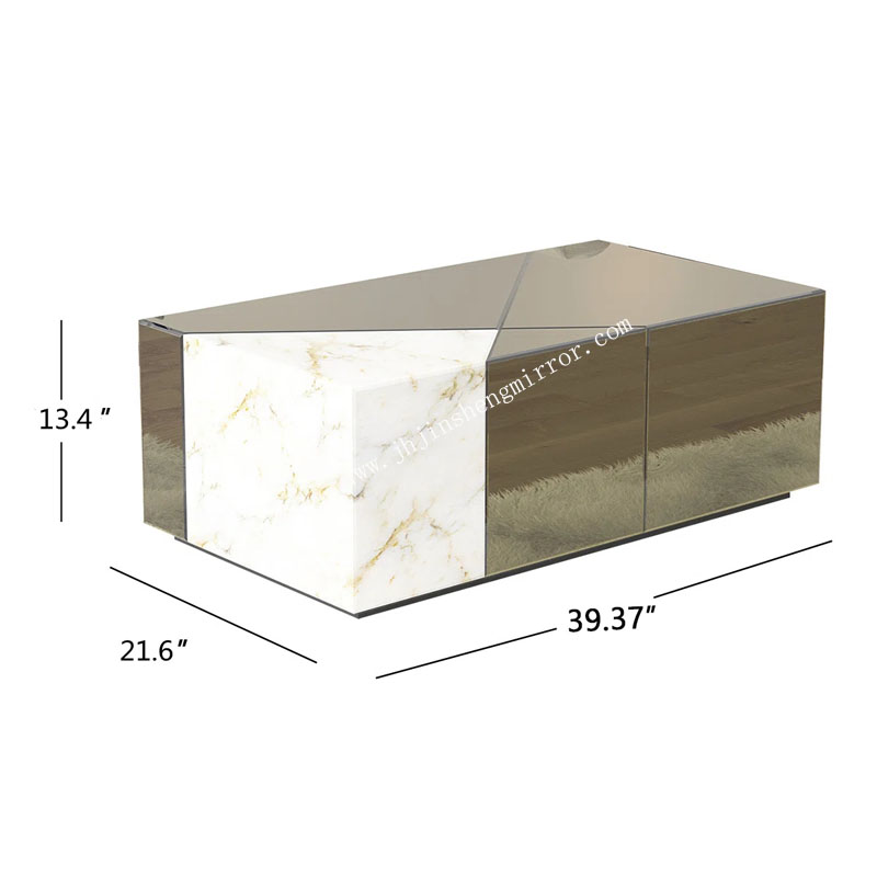 The JS-CT12 Mirrored Block Coffee Table showcases a distinctive patchwork design, combining brown tinted mirrors with elegant marble patterns. Its solid rectangular block form provides a bold, minimalist aesthetic suitable for high-end lounges and contemporary living areas.